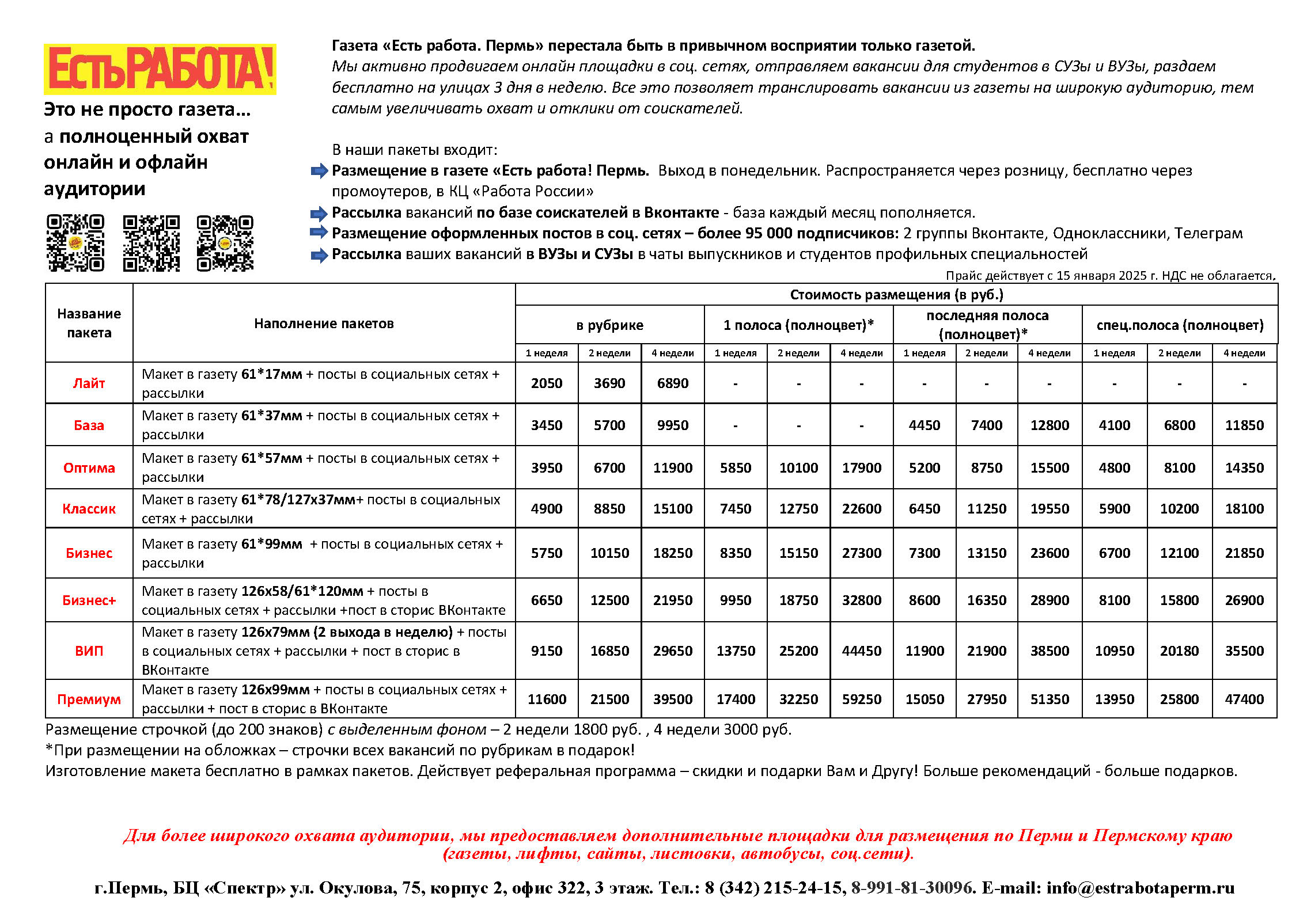 При пакетном размещении в газете, вакансии выкладываются в группы Вконтакте, Одноклассники и Телеграм.